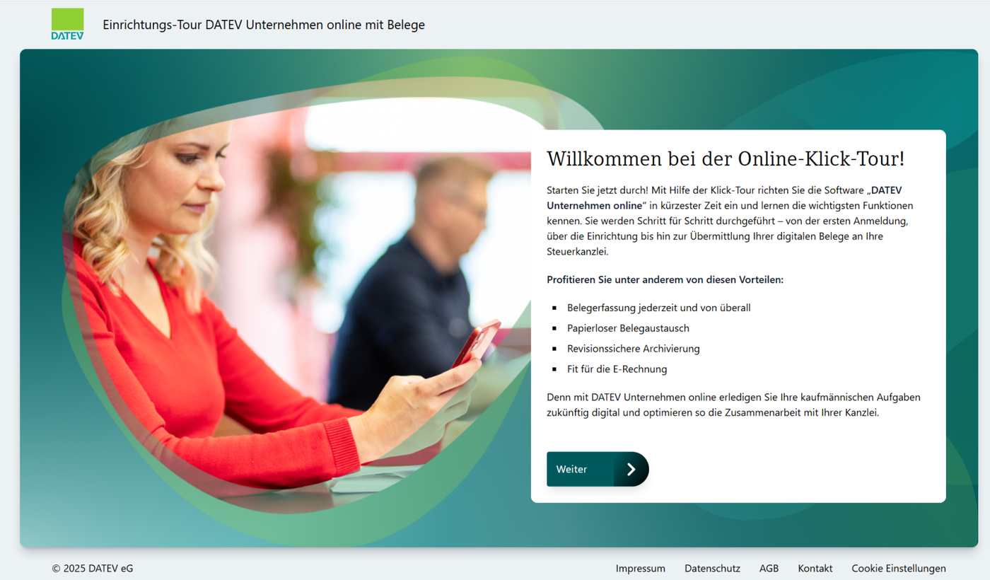 Starten Sie mit unserer Online-Tour! Leiten Sie den Link start-duo.datev.de an Ihre Mandanten weiter. In der Klick-Tour erfährt Ihr Mandant die ersten Schritte von der Aktivierung des Zugangsmediums über den ersten Einstieg in DATEV Unternehmen online bis zur Nutzung von Belege online.